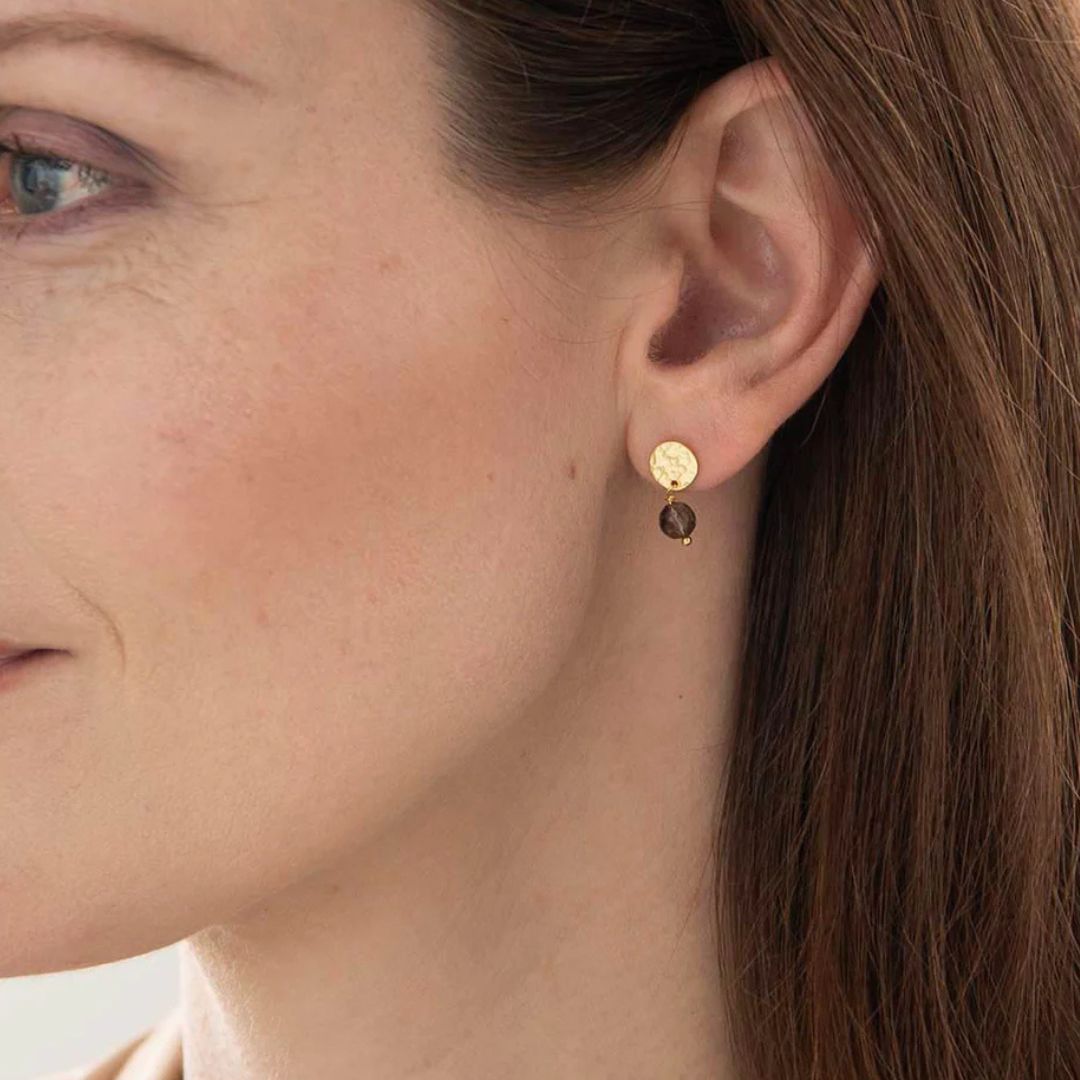 Rookkwarts staat bekend om zijn beschermende en zuiverende werking. Het helpt bij het loslaten van negatieve energie en bevordert innerlijke rust. De vergulde afwerking geeft deze minimalistische oorbellen een warme, luxe uitstraling, terwijl het compacte formaat ze ideaal maakt voor dagelijks gebruik.