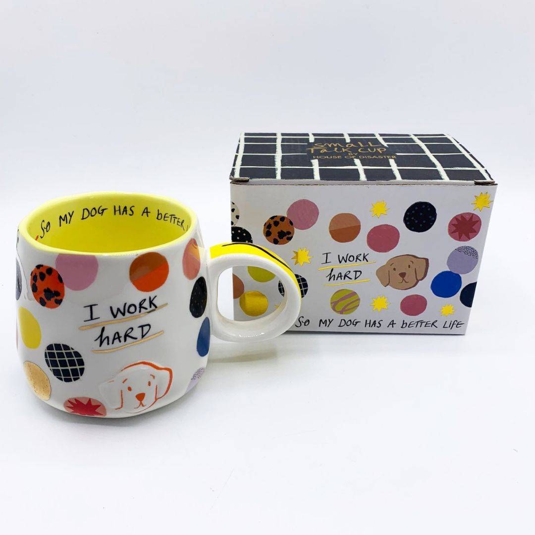 Deze keramische mok heeft een handgemaakt, eigenzinnig design en is versierd met een vrolijk bolletjespatroon. Op de voorkant prijkt een schattige 3D-hond die direct de show steelt. De grappige boodschap loopt van buiten naar binnen en luidt: "Ik werk hard – zodat mijn hond een beter leven heeft."