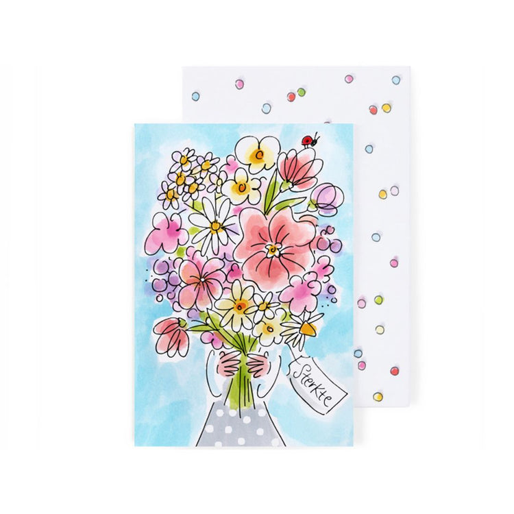 Natuurlijk wordt elke kaart geleverd met een bijpassende vrolijke envelop, zodat je jouw wens stijlvol én compleet kunt versturen. Het herkenbare, handgetekende Blond Amsterdam-design zorgt direct voor een lach op het gezicht van de ontvanger.