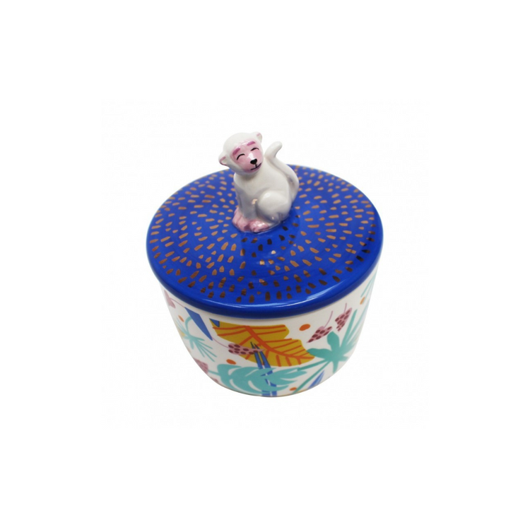 Caractéristiques : un joli pot de singe parfait pour ranger des objets tels que des bijoux, des épingles et des clips ou des tampons de coton. Ce bocal présente un joli singe assis sur le couvercle doré avec un imprimé jungle contrastant sur le corps du bocal.