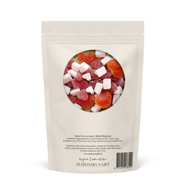 De kleurrijke mix is niet alleen lekker zacht en fruitig van smaak, maar ook onweerstaanbaar om te zien. Met circa 200 gram aan Haribo-hartjes is dit snoepzakje het ultieme zoete gebaar.