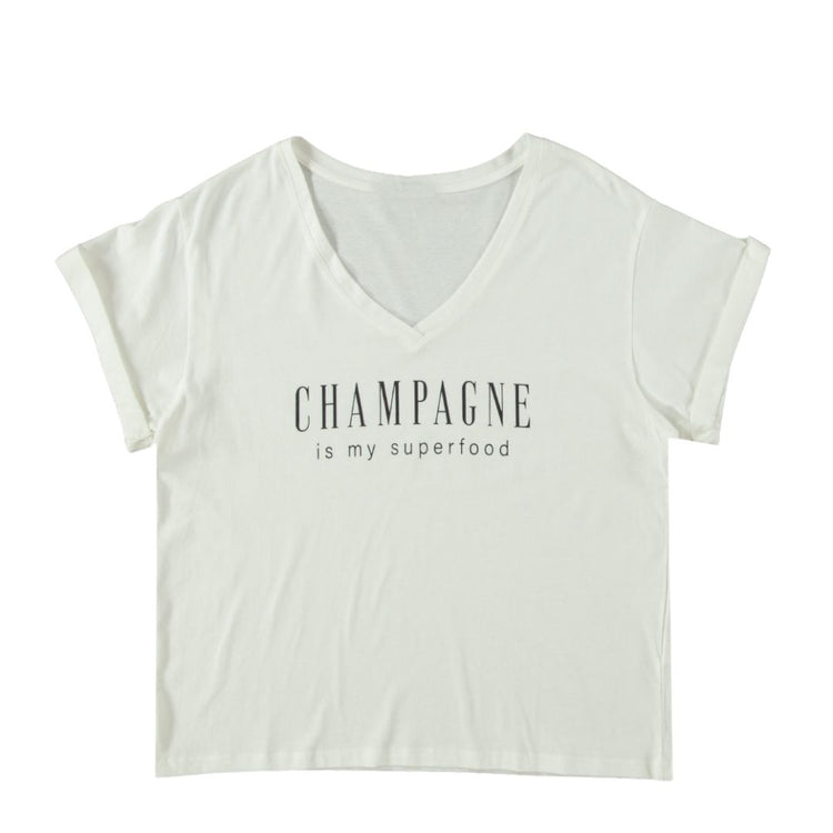Wit T-shirt met Zwarte Opdruk – “Champagne is my Superfood”