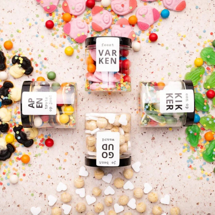 Dit kleurrijke potje van 130 gram zit bomvol lekkers: vrolijke kauwgomballen, zoete snoepvarkens en confetti snoepjes zorgen voor een instant feestje in elke hap. Op het witte etiket staat de tekst ‘Feestvarken’ – speels, feestelijk en met een knipoog.